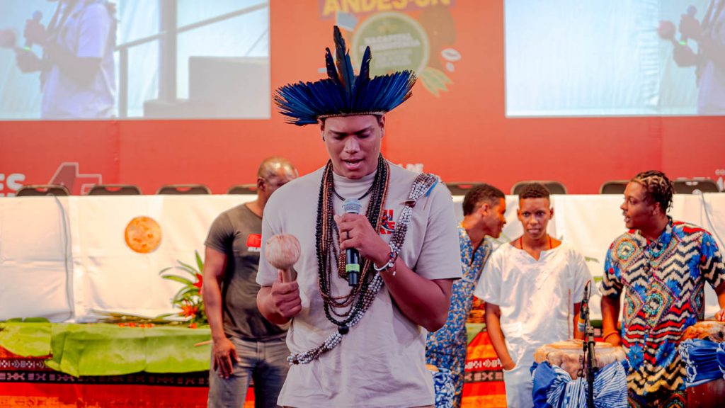 Em seguida, ocorreu a apresentação do artista Thiago Tupinambá, liderança jovem do povo Tupinambá de Abrantes e estudante da Escola de Belas Artes da UFBA, que realizou a apresentação cultural “Cantada Indígena”.