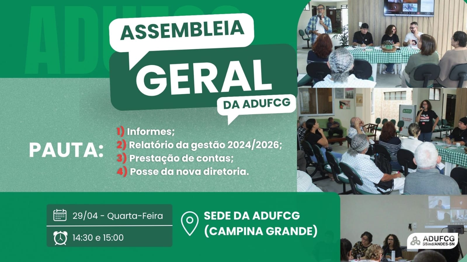 DATA:28/04/2026 – Quarta-feiraHORÁRIO: 14H30 – 1ª CHAMADA – 15H – 2ª CHAMADA LOCAL: Auditório da ADUFCGPAUTA: 1) Informes 2) Relatório […]