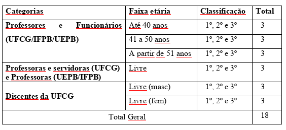 - Professores e Servidores Técnicos – Masculino – 1º, 2º e 3º lugares