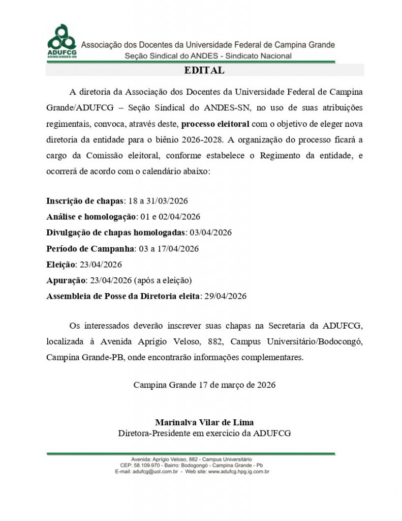 ADUFCG divulga edital de convocação de eleição da próxima diretoria (2026-2028)