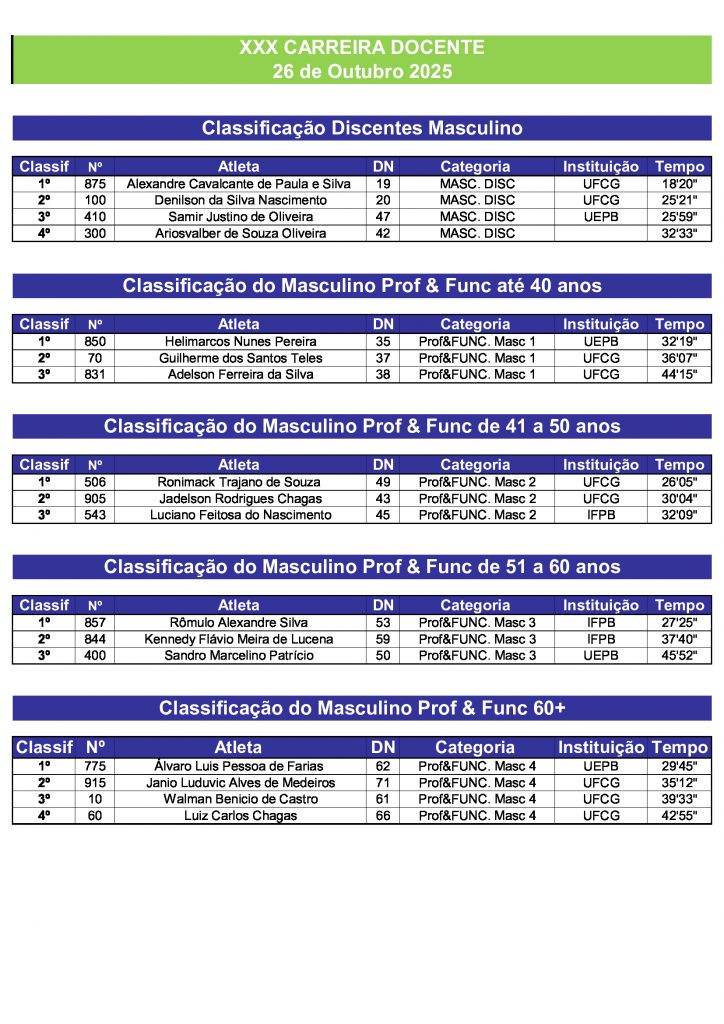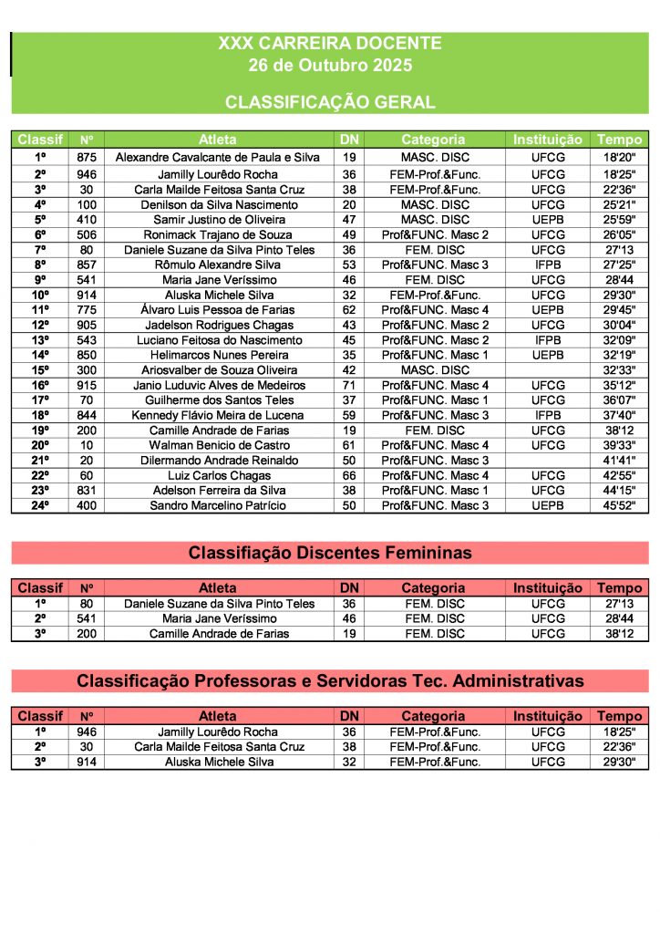 Veja os resultados da Carreira, de acordo com cada categoria: